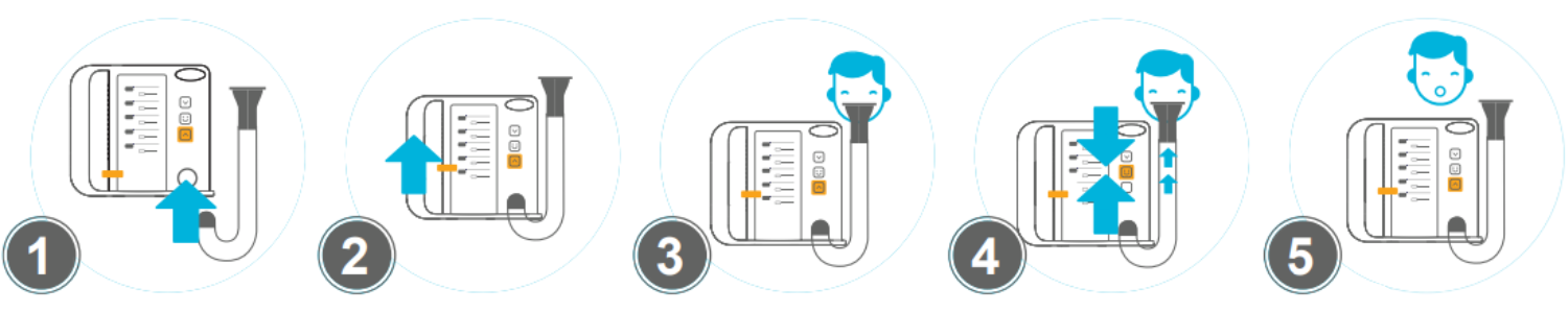 - Houd of plaats de spirometer rechtop. Adem normaal uit. Plaats vervolgens de lippen strak om het mondstuk.