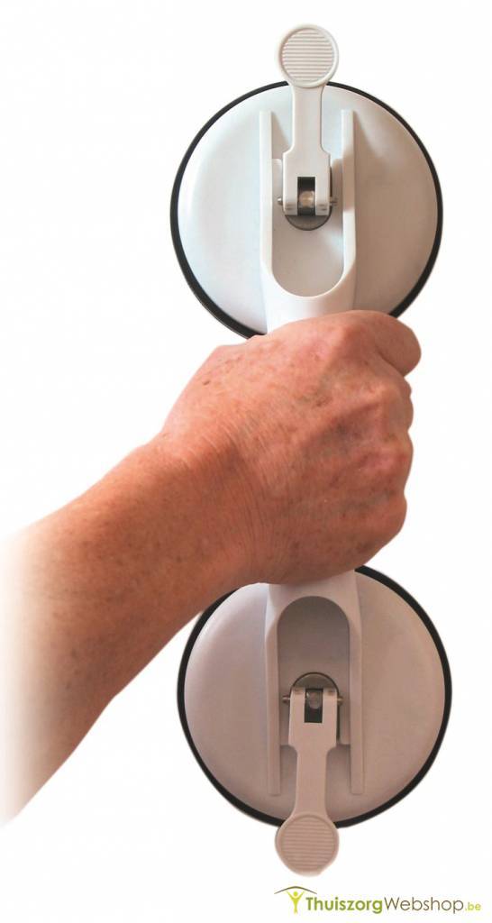 Wandbeugel met zuignappen van 12 cm, diameter handgreep 3,5 cm. Een vaste lengte is economischer dan een verstelbare. Men vermijdt de voegen door de beugel eventueel schuin te plaatsen. De korte versie van 10 cm is bedoeld voor één hand. Deze beugels hebben geen veiligheidsindicator.
