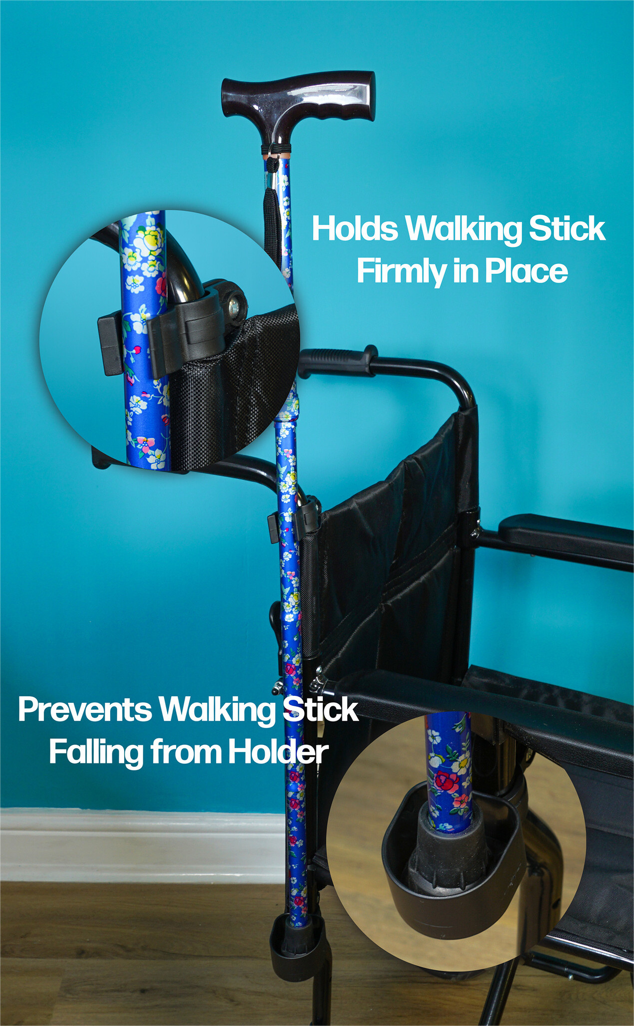 Houd uw wandelstok aan uw zijde als u in een rolstoel of scootmobiel zit. Met deze handige houder kan een wandelstok/kruk stevig aan uw rolstoel of rollator worden bevestigd.