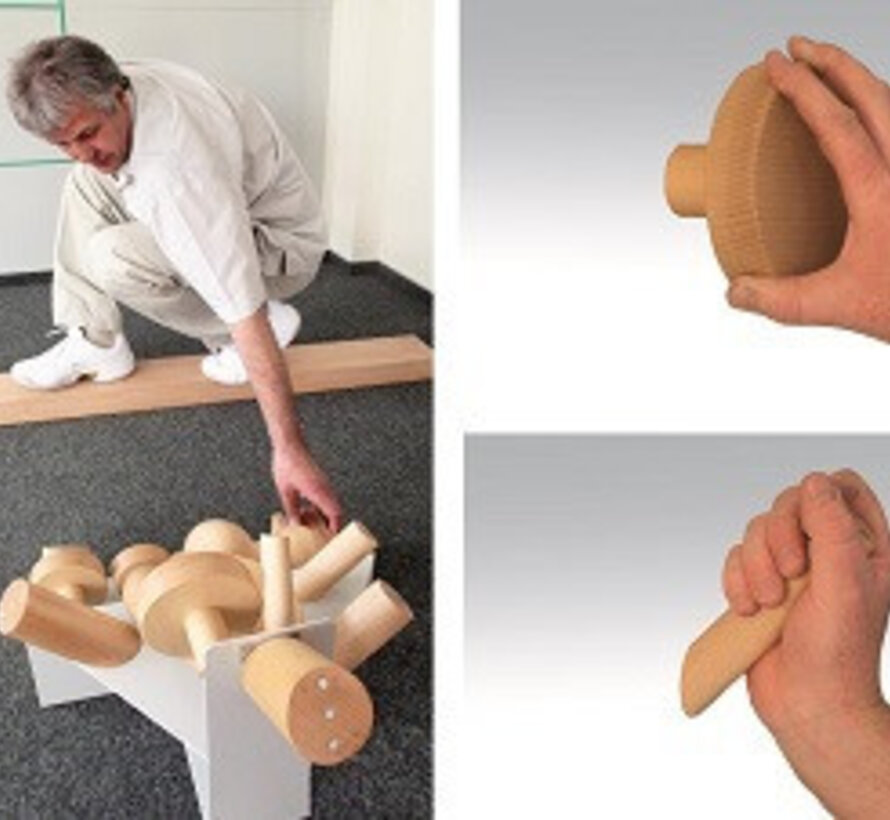 WP5 bestaat uit 19 verschillende houten elementen, voorzien van magneten.O.a. cilindervormen, sleutelgreep, bolvorm, schijven... Metalen element met 3 oppervlakken, voorzien van antislipvoetjes.